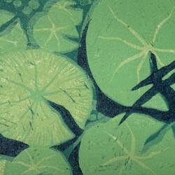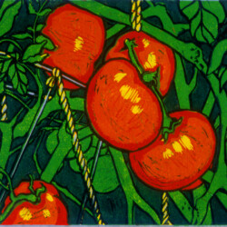 One of the relief techniques of printmaking, linocuts are created by gouging away the negative parts of a composition on a linoleum block. Ink is rolled on the remaining surface and transferred to paper to create the image, which is why they are often called “type high”.